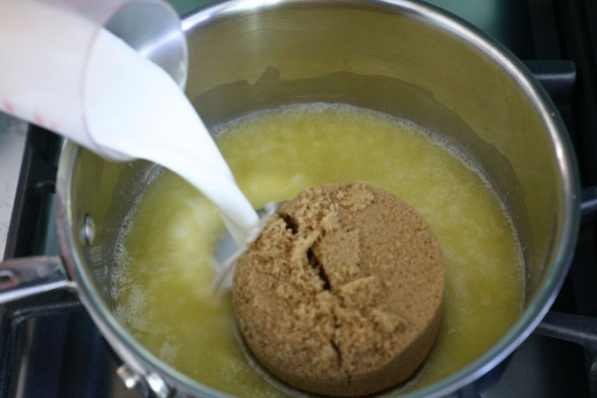- Simply melt the butter over medium-high heat. Stir in the brown sugar and milk with a wooden spoon or whisk.