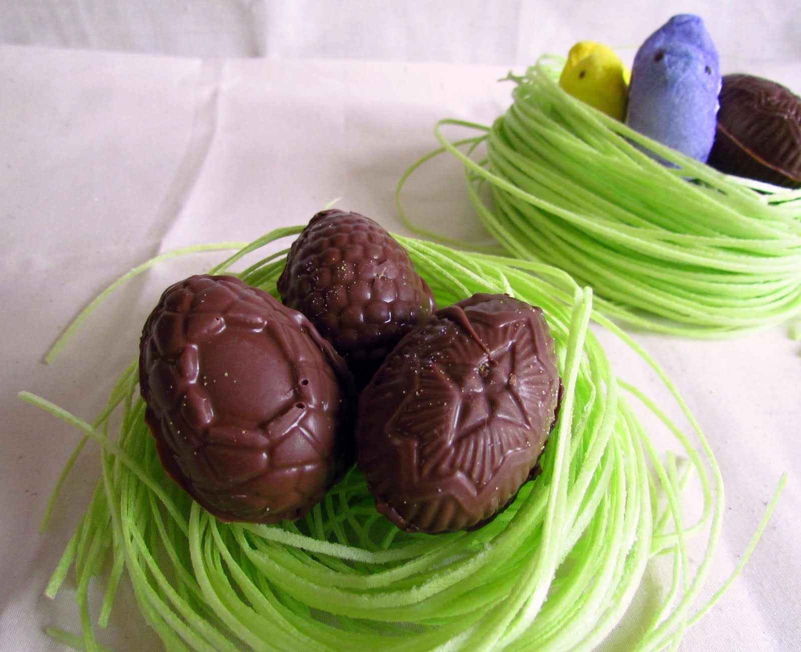 What’s great about these baby peeps is that you can make as many (or few) that you want. One bag of Wilton’s Melts will make about ten eggs. The nests are made out of edible Easter grass I found at Joann Fabrics. Neat, huh? No more nasty plastic stringy grass that gets everywhere!