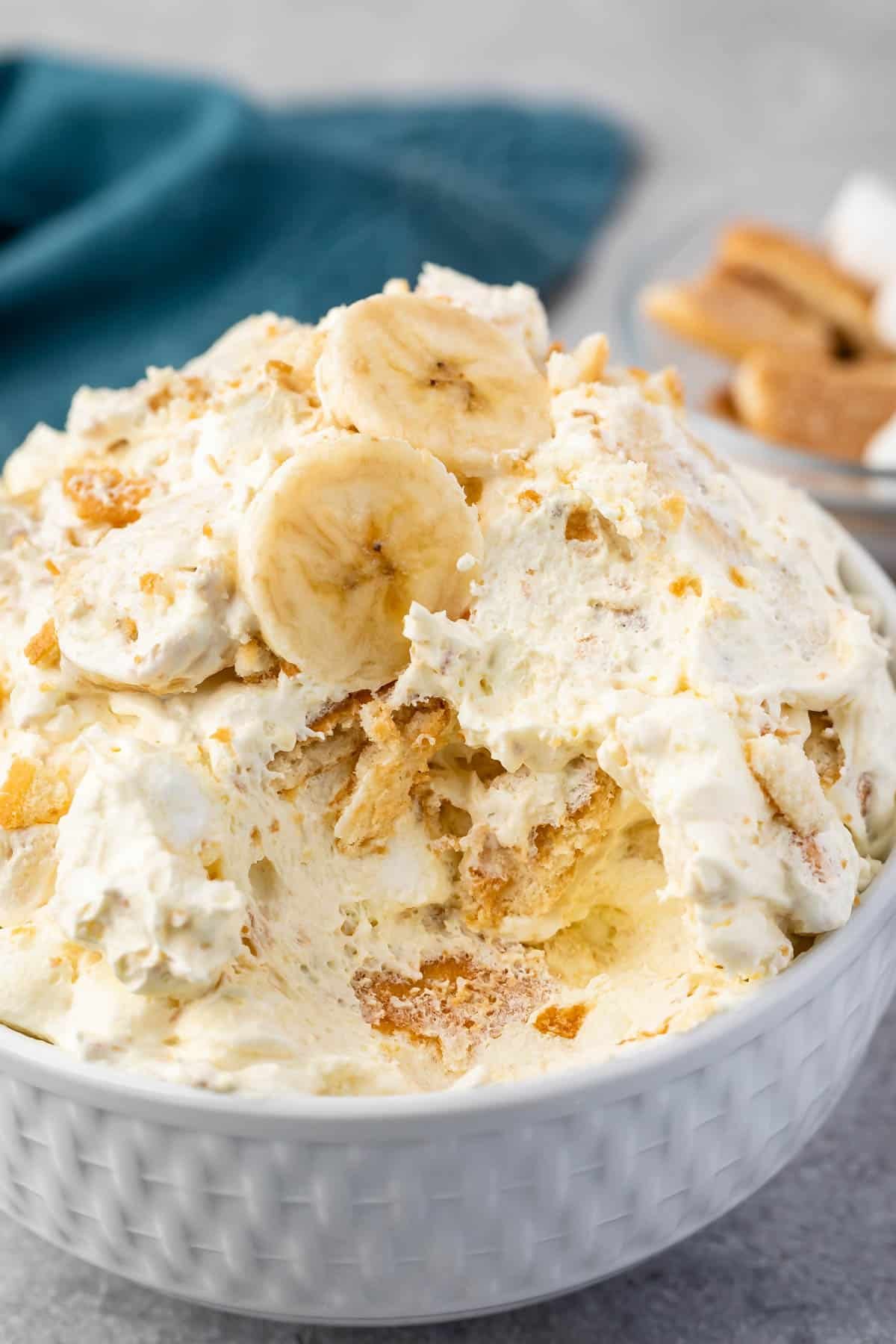If you’re looking for an easy banana pudding, then look no further: You are going to love this banana pudding fluff recipe. It’s basically your classic southern recipe but made easy with instant vanilla mix and Nila wafers all mixed up like dessert fluff salad!