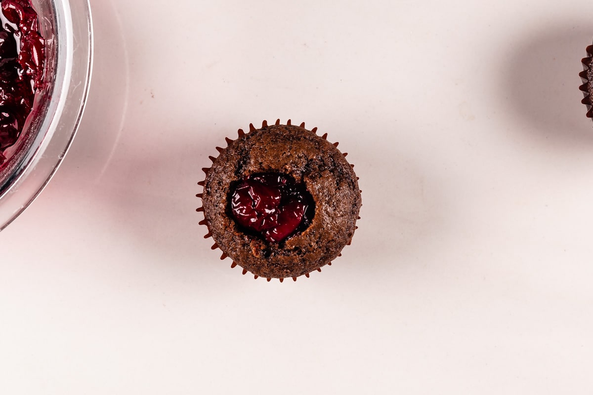 8. Fill the cupcake with the tart cherry sauce and replace part of the cupcake you removed. Then frost and top with a cherry and chocolate shavings.