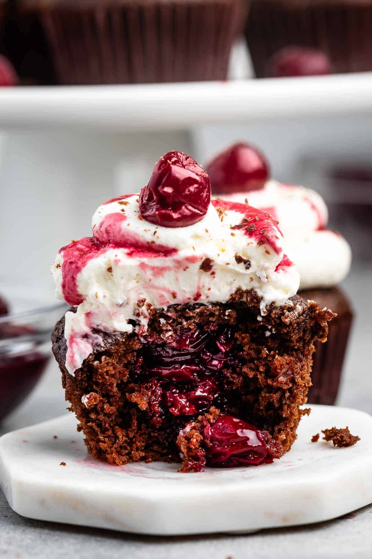 These easy cupcakes start with my favorite chocolate cupcake recipe and are filled with an easy tart cherry filling and then I topped them off with whipped cream topping – it’s like eating a classic Black Forest Cake in cupcake form and they’re delicious!