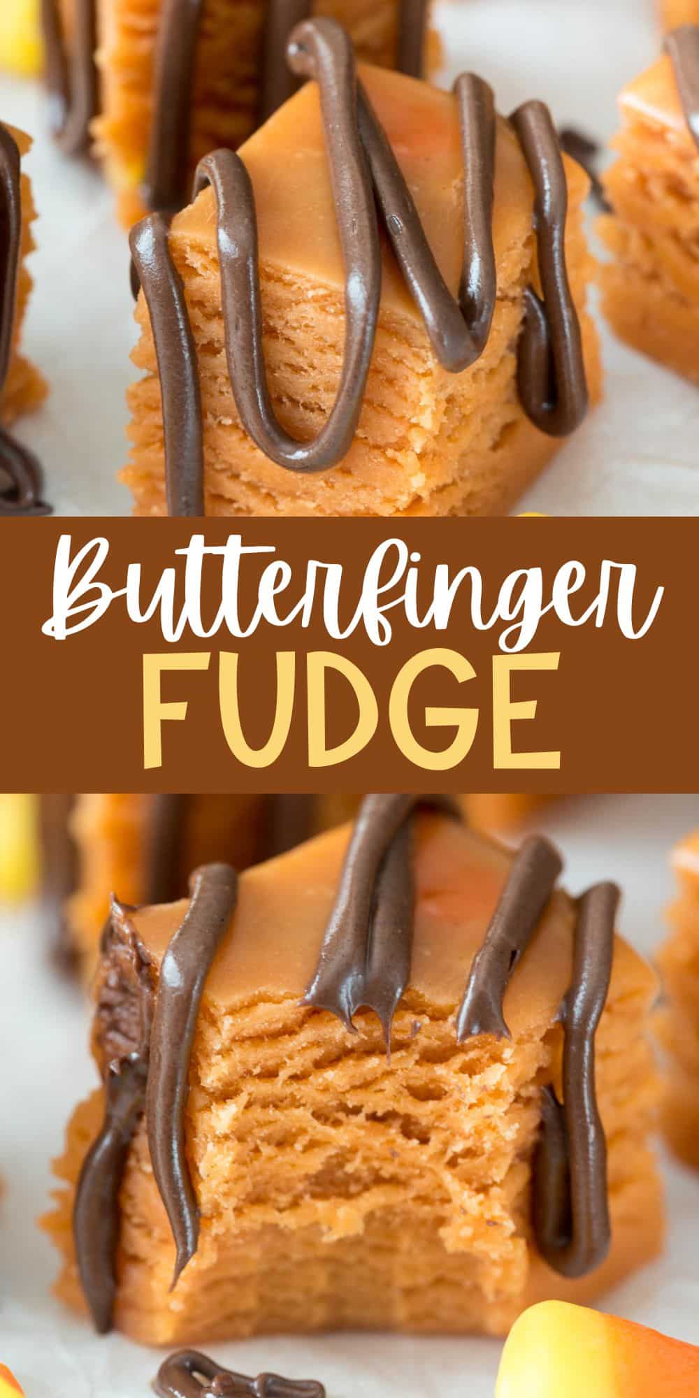 This Butterfinger Fudge is a simple and easy recipe that only has 4 ingredients! It tastes just like your favorite candy bar and it is made with candy corn! It’s a mind-blowing fudge recipe – you’re going love it because it tastes like Butterfingers!