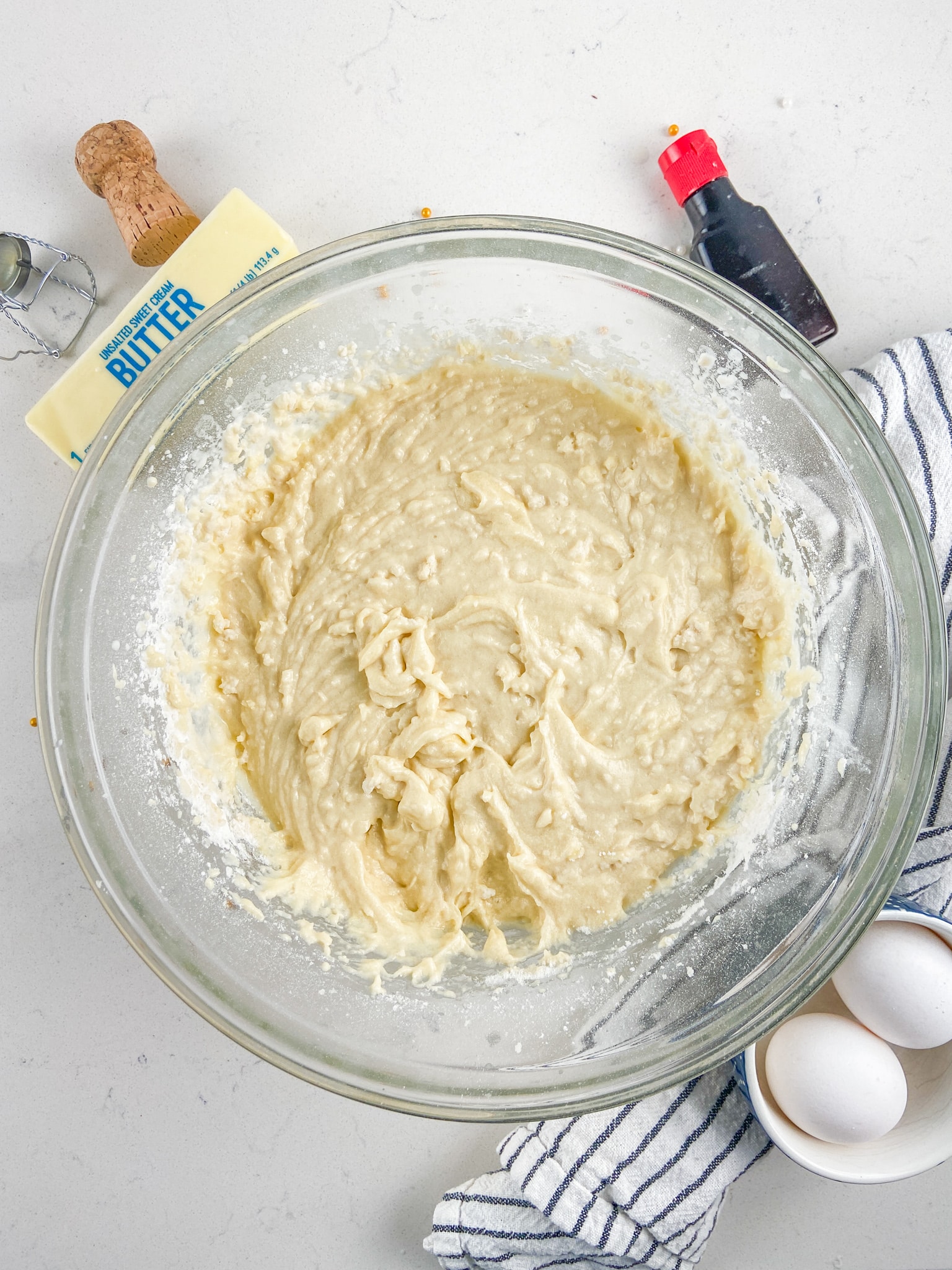 - Cream butter and sugar in a large bowl with a hand mixer (or use an electric stand mixer fitted with the paddle attachment). Beat until butter is light and fluffy, then mix in eggs, one at a time. Beat in vanilla extract.