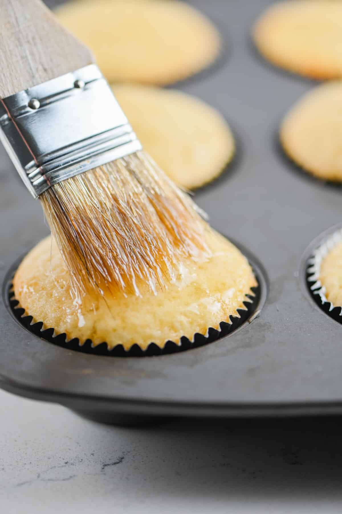 - When the cupcakes come out of the oven, brush the syrup over the top of the warm cupcakes. Cool completely before frosting.
