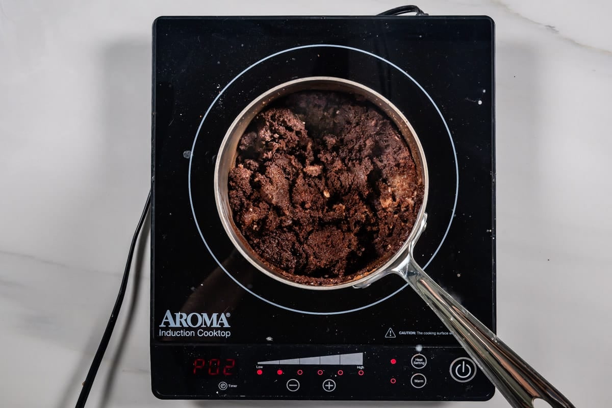 - Melt the butter in a large saucepan over medium heat. Stir in sugar, cocoa, and a pinch of salt. The mixture will be thick and grainy.