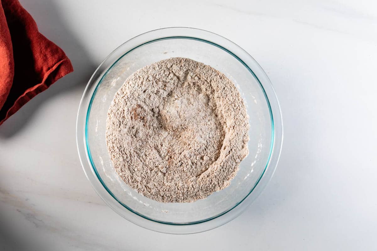 - I like to start by whisking all my dry ingredients in a medium bowl. Make sure to measure your flour correctly!