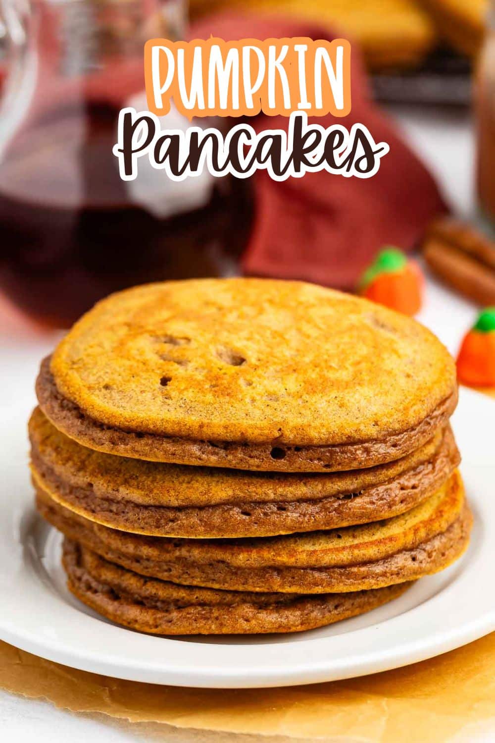 My Fluffy Pumpkin Pancakes Recipe is from scratch, easy to make, and is done in un no time at all. These are a one bowl pancake recipe that are moist, perfectly pumpkin spiced, and delicious with maple syrup. It’s the perfect fall breakfast and you can even make these ahead and freeze them!