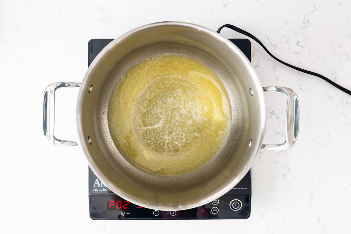 - Melt the butter in a large pot over medium low heat. Continue cooking the butter, stirring occasionally, until the butter browns. This will take 3-7 minutes depending on the size of your pan, but just watch it – it’ll foam then reduce and little brown flecks will form in the bottom of the pan.