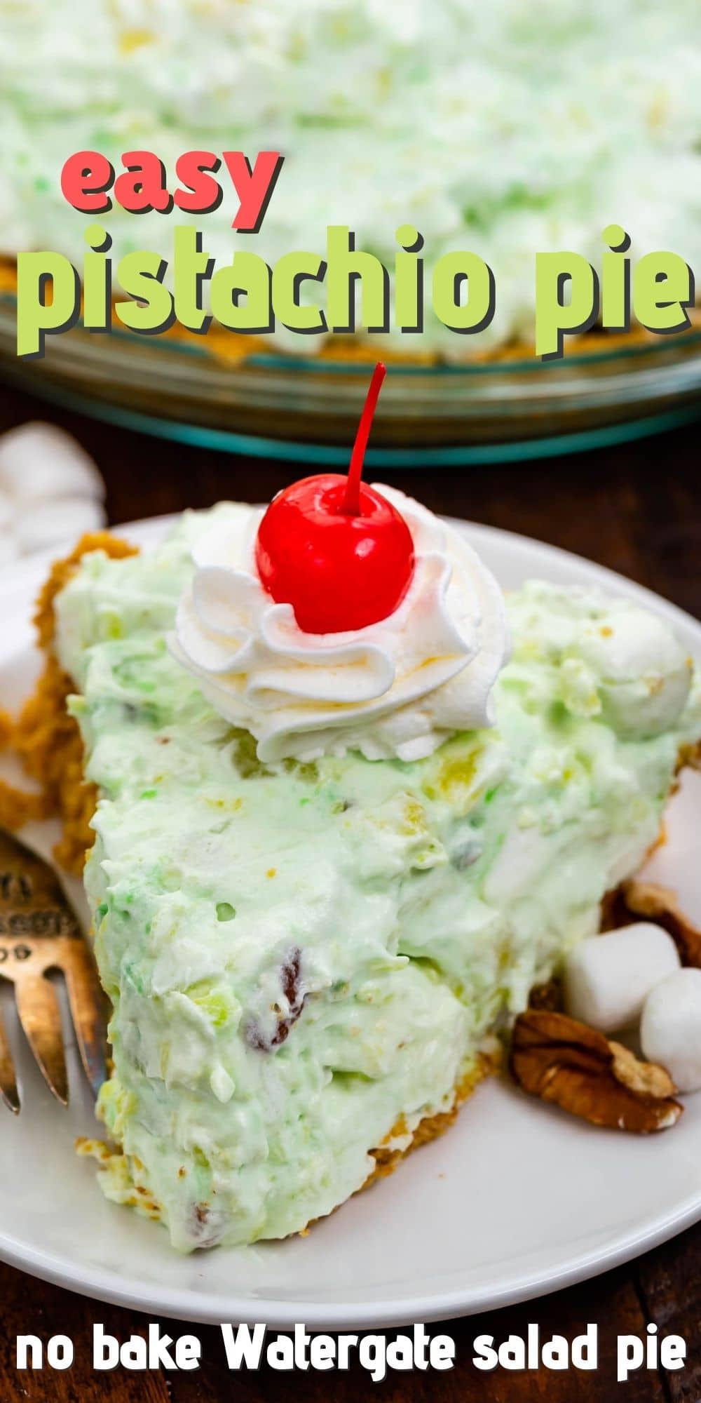 Watergate Salad Pie is a pistachio pudding pie filled with pistachio pudding and marshmallows, all in a graham cracker crust. The crunchy pistachios and the creamy pie filling are so, so good!
